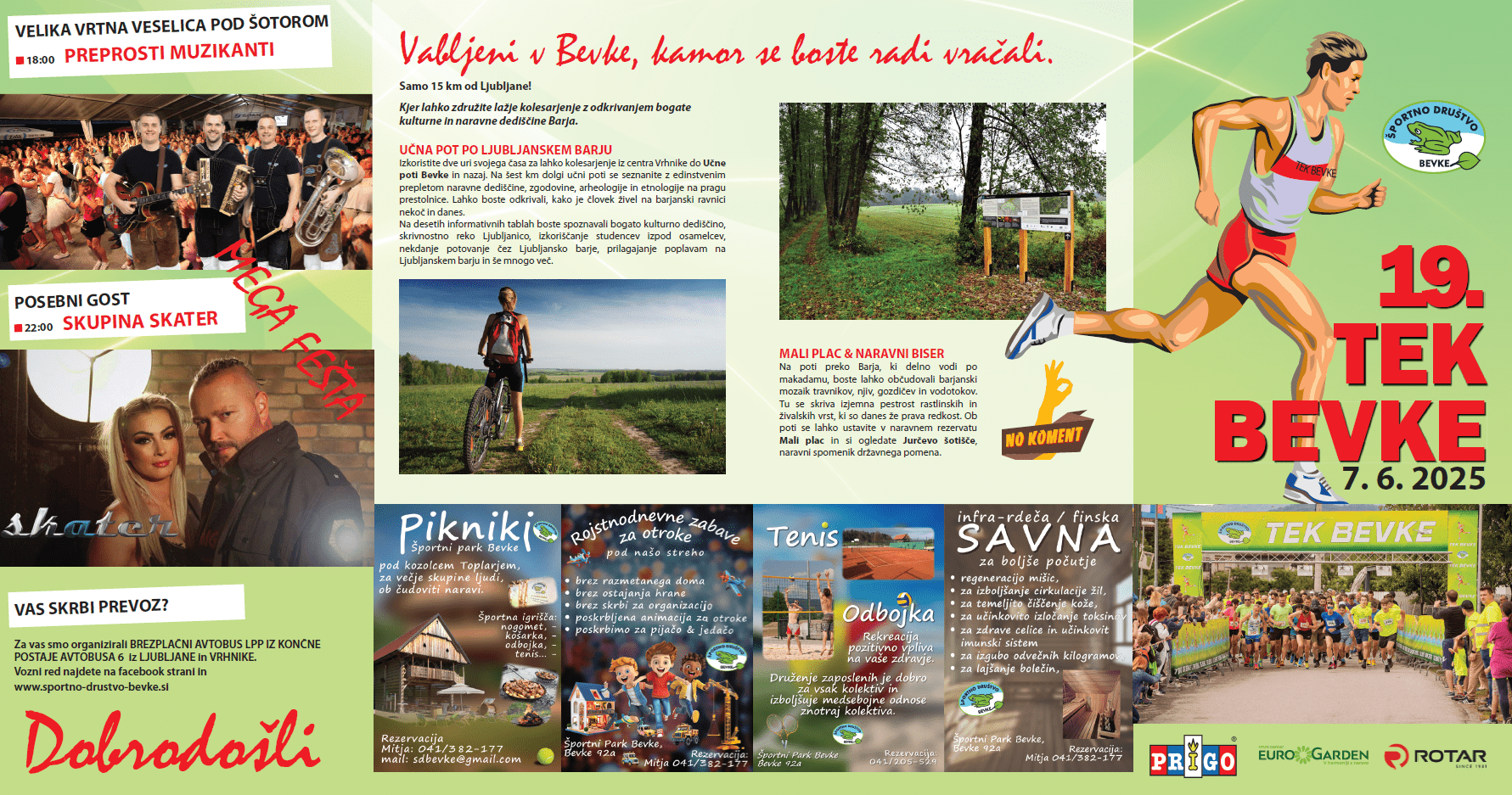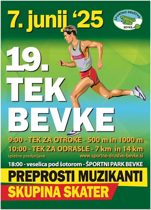 V soboto, 7. 6. 2025, vas vabimo na športno prireditev 19. TEK BEVKE, zvečer pa nas bo zabavala skupina Skater in ansambel Preprosti muzikanti.