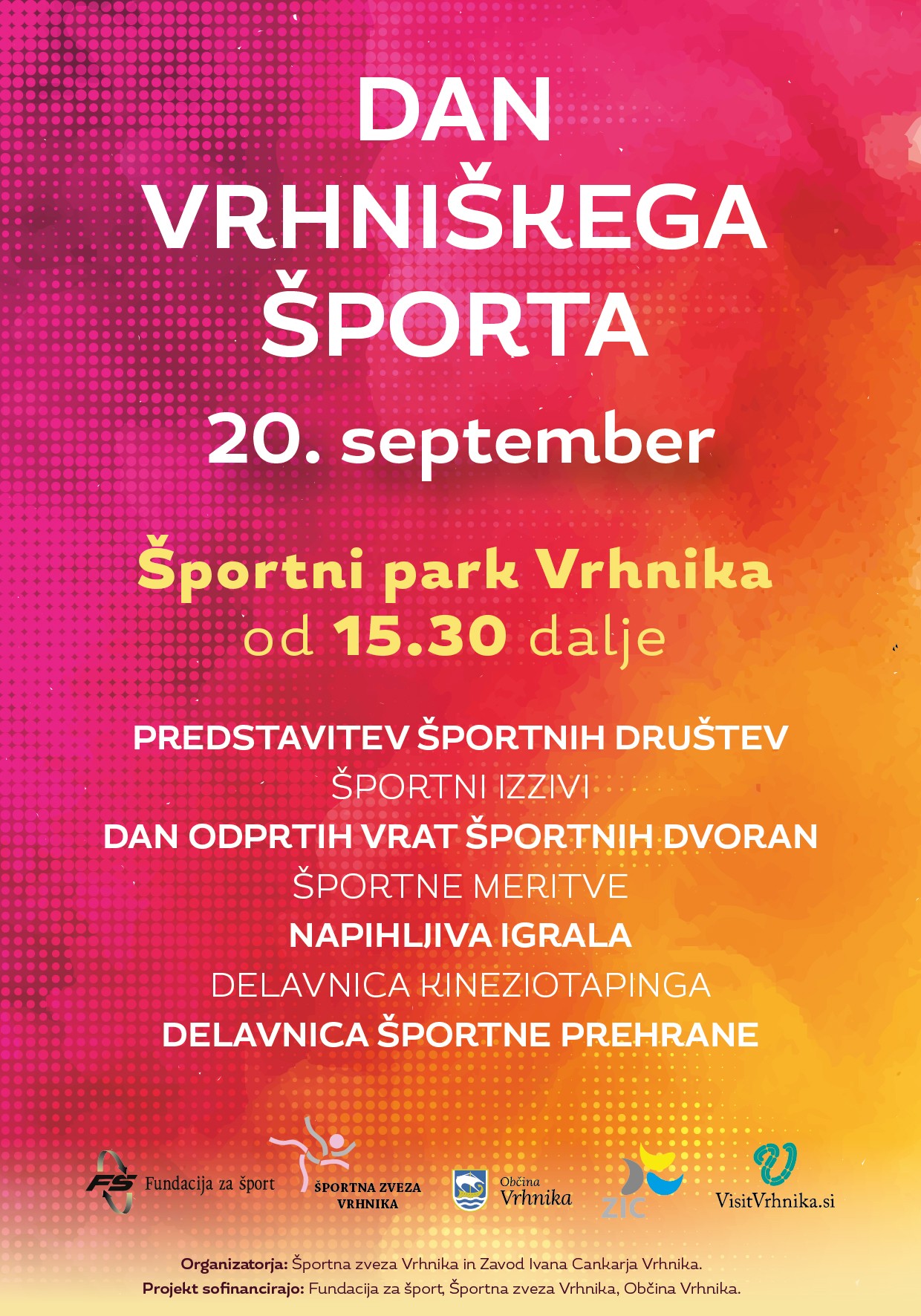 Športna zveza Vrhnika in ZIC Vrhnika kot uvod v »Dan slovenskega športa« in »Evropski teden športa« organizirata dogodek »Dan vrhniškega športa«. Program bo potekal od 15.30 do cca. 20.00 v Športnem parku Vrhnika. Glavni del programa bo potekal po razporedu iz časovnice, podrobnejši opis dogajanja pa si preberite v nadaljevanju: