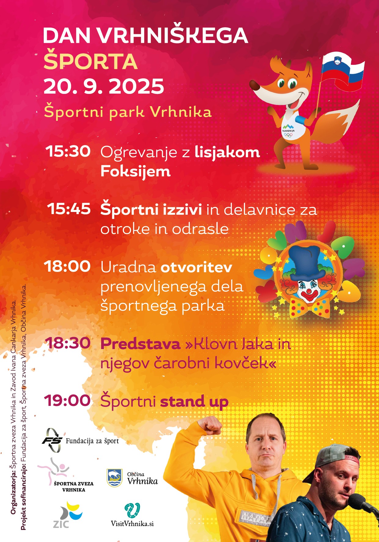 Na dan dogodka (20. 9. 2025) bodo med 16.00 in 19.00 tudi »odprta vrata« vseh 3 športnih dvoran v upravljanju Zavoda Ivana Cankarja Vrhnika.