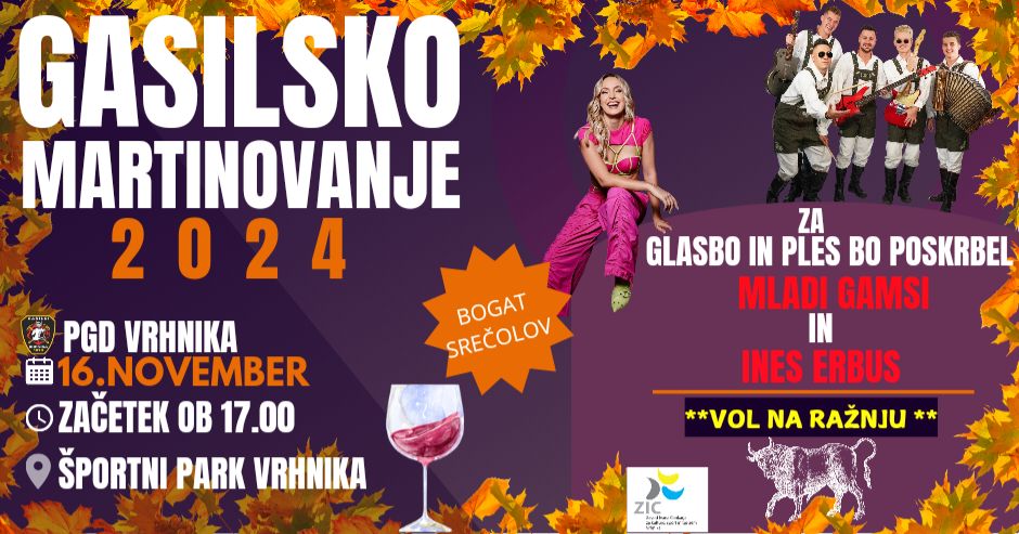 V soboto 16.11.2024 vas v športnem parku Vrhnika čaka nepozabno doživetje!Prihaja drugo GASILSKO MARTINOVANJE POD ŠOTOROM🍷🌰 s skupino MLADI GAMSI in INES ERBUS🎤🪗. Čaka vas bogat srečelov, dobra jedača in pijača! Vabljeni!