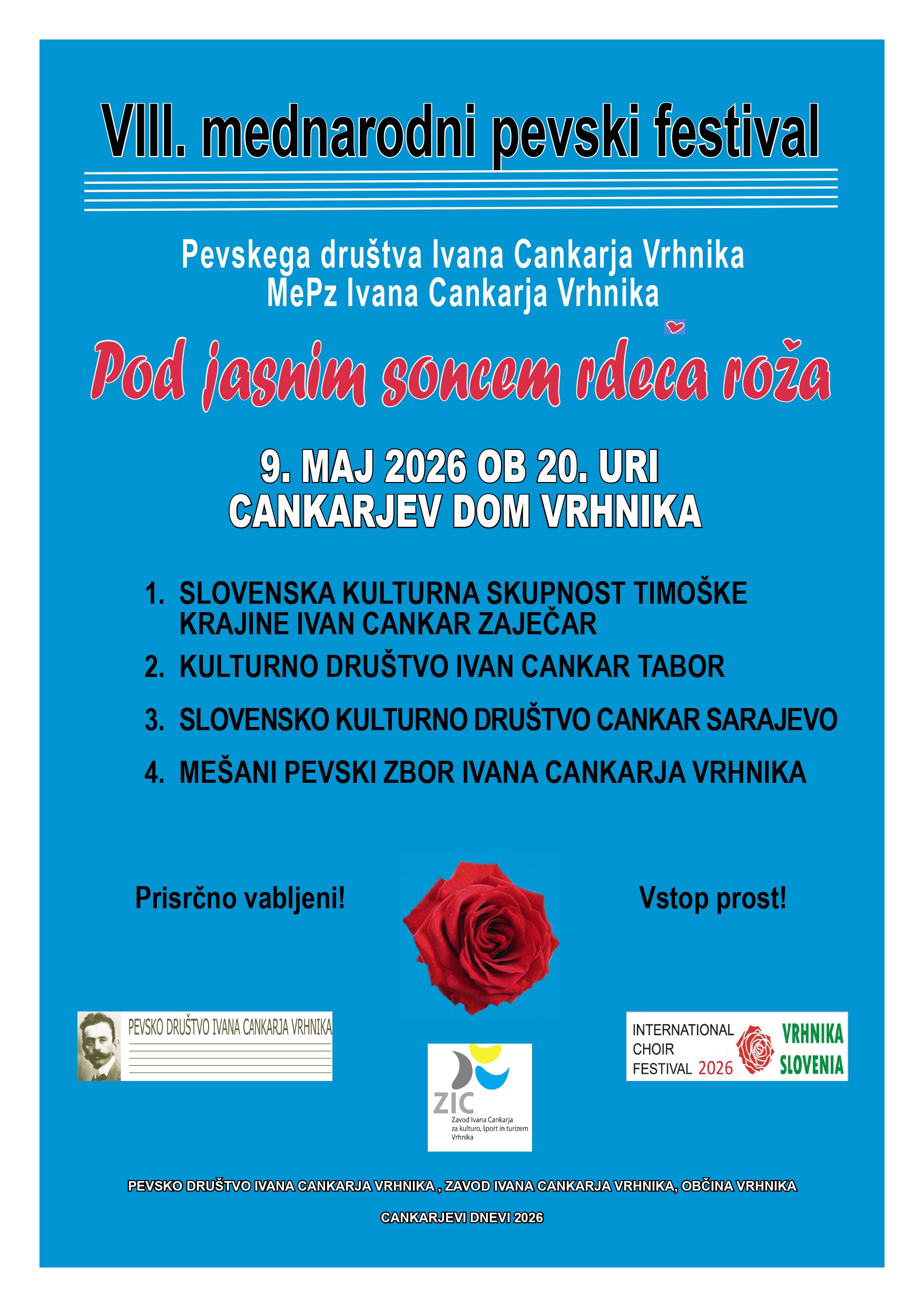 VABIMO VAS NA VIII. MEDNARODNI PEVSKI FESTIVAL PEVSKEGA DRUŠTVA IVANA CANKARJA POD NASLOVOM "POD JASNIM SONCEM RDEČA ROŽA", KI BO 9. MAJA OB 20. URI V CANKARJEVEM DOMU NA VRHNIKI.