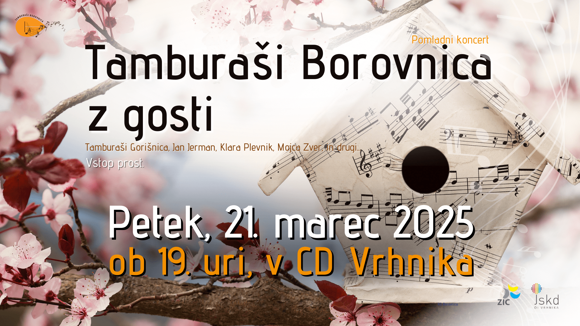 Na prvi pomladni dan, v petek, 21. marca ob 19. uri vas Tamburaši Borovnica vljudno vabijo v Veliko dvorano Cankarjevega doma na Vrhniki na prečudovit in nepozabni glasbeni večer!