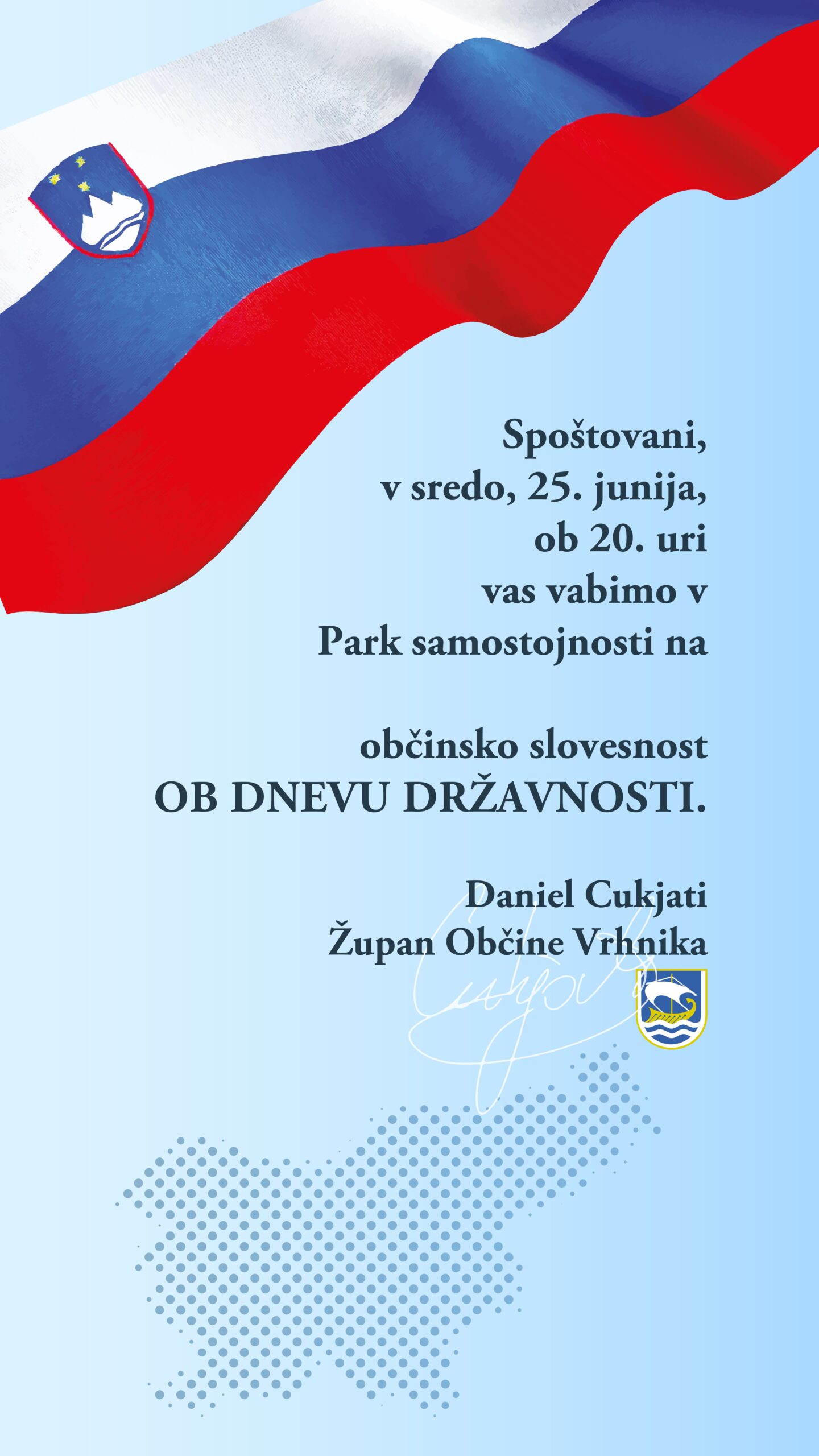 Občina Vrhnika vas vabi na praznovanje Dneva državnosti, ki bo potekalo 25. junija ob 20. uri v Parku samostojnosti.