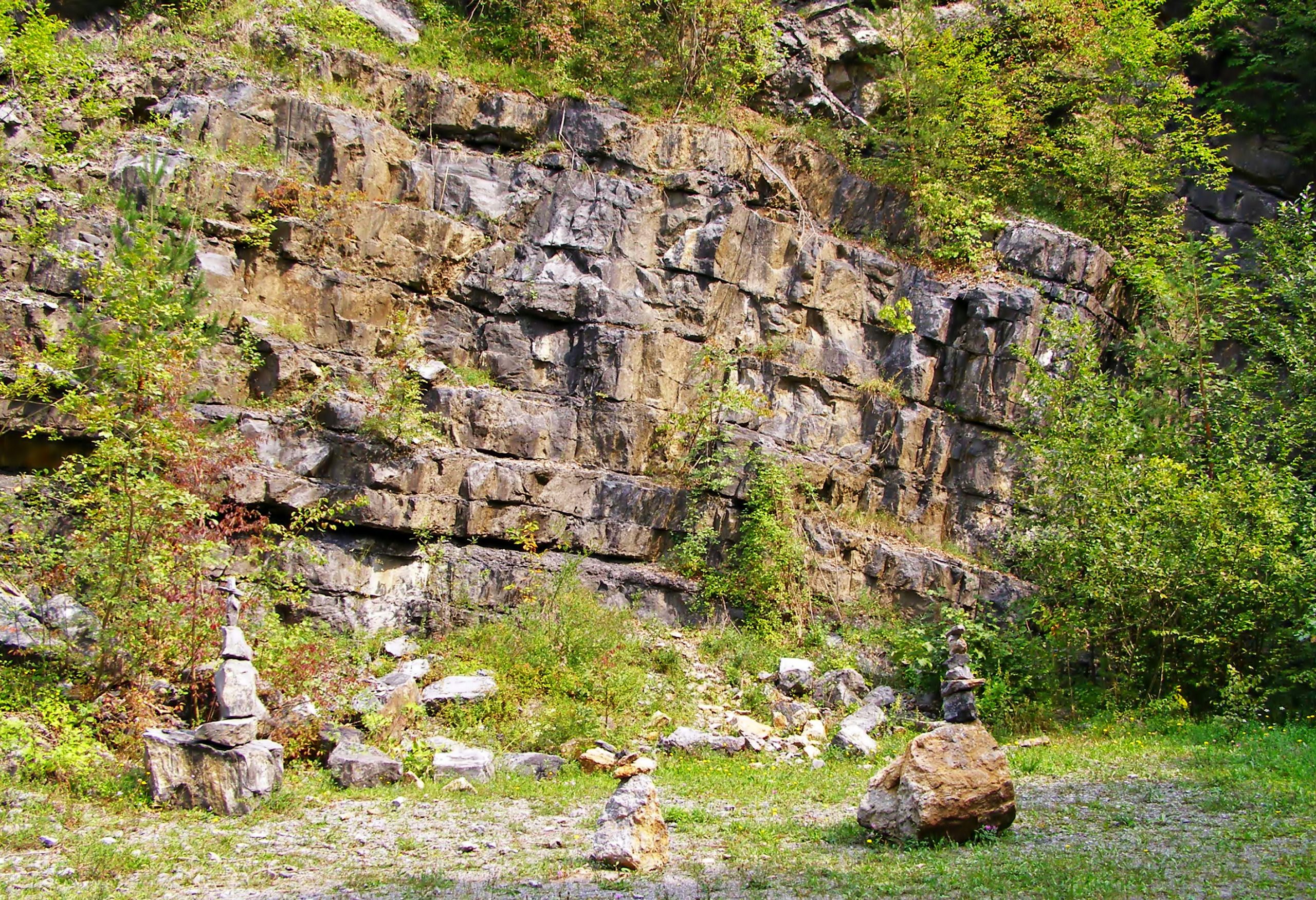 Nowadays, the quarry is known for its rich deposit of fossilised shells and other microfossils, as well as an exquisite example of a tectonic fold. There are extensive areas of exposed dark-grey to black limestone with shale inclusions in the immediate vicinity.  The quarry also features a geological column showing the rocks found in the wider area and some statues a little further away, which were made by various artists at an international sculpture symposium.